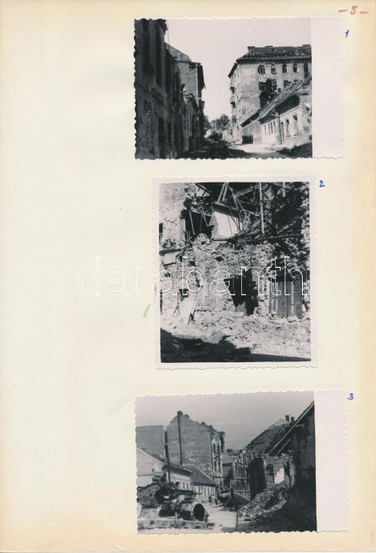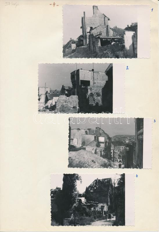 1945 Budapest, a budai vár állapota az ostrom után, romok, kilőtt harci járművek, hidak maradványa, egy privát fotónapló 11 lapjára felragasztott 37 db dokufotó, képméret 6x9 cm