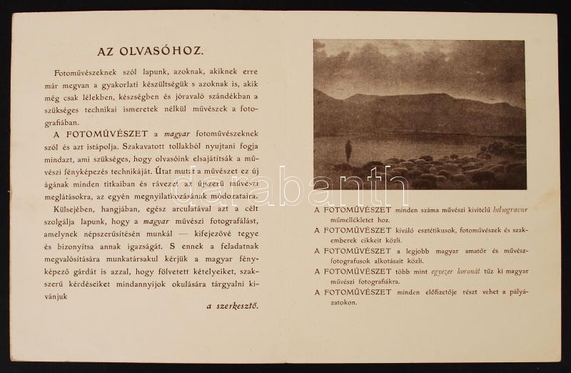 Beschreibung: A Fotóművészet amatőr és művészfotográfiai folyóirat (szerk. Balogh Rudolf) kinyitható reklámlapja, rajta Gara Arnold grafikájával, 12x15 cm
