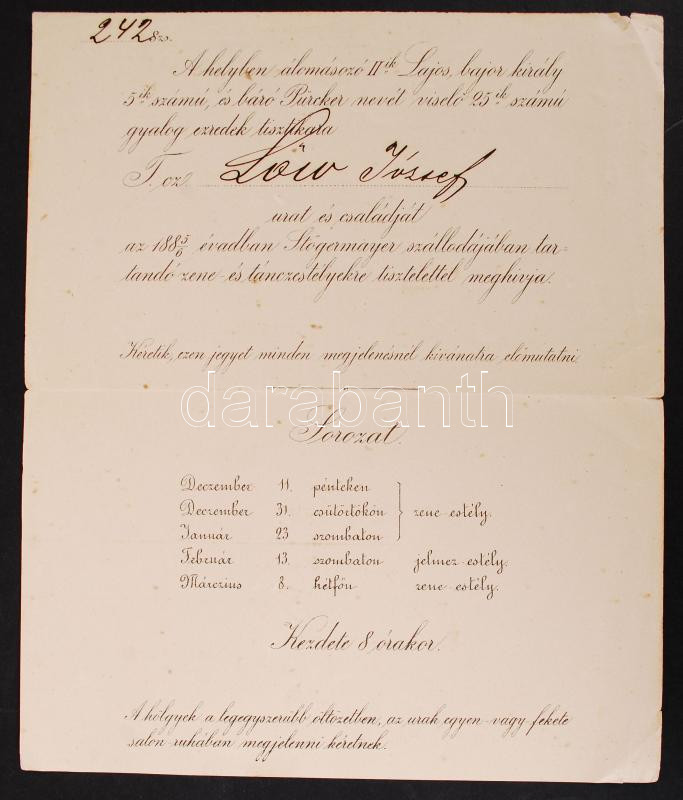 Beschreibung: 1885 Meghívó II. Lajos bajor király 5. számú és báró Pürcker nevét viselő 25. gyalogezredek tisztikara által rendezett bálokra