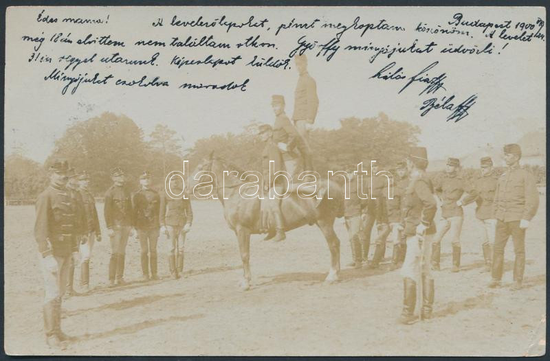 Beschreibung: 1900 Budapestről Barothra küldött privát katonai fotólap virtuóz lovas katonákról, 9x14 cm