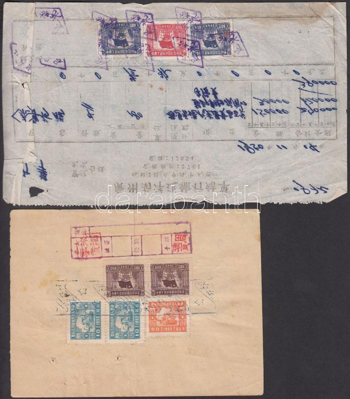 Beschreibung: Kínai Népköztársaság 1950-1952 2 db számla illetékbélyegekkel