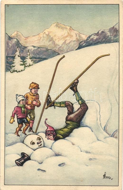 Skiers, humour, snowman, artist signed (EK) https://www.darabanth.com/de/215-Fernauktion/215.0/Ansichtskarten/Sport~40090/Skiers-humour-snowman-artist-signed-EK~II906592
