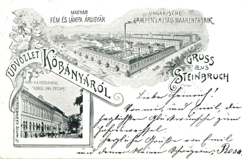 1899 Budapest X. Kőbánya, Steinbruch; Magyar fém- és lámpaárugyár, pos... https://www.darabanth.com/de/215-Fernauktion/215.0/Ansichtskarten/Ungarn~40010/1899-Budapest-X-Kobanya-Steinbruch-Magyar-fem-es-lampaarugyar-postahivatal-floral-EK~II906480