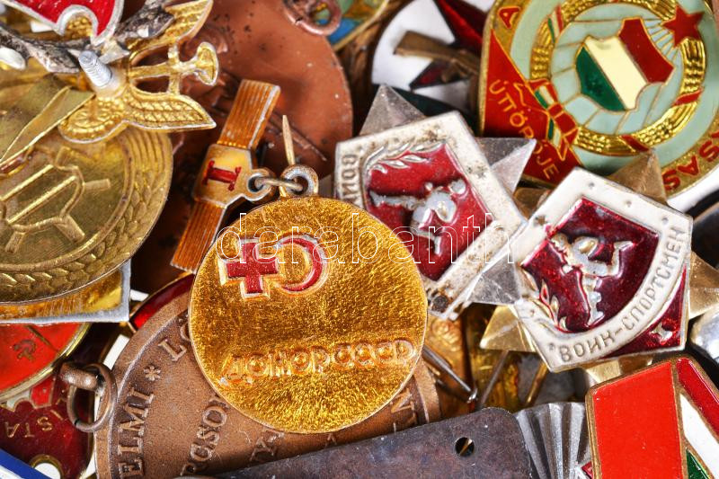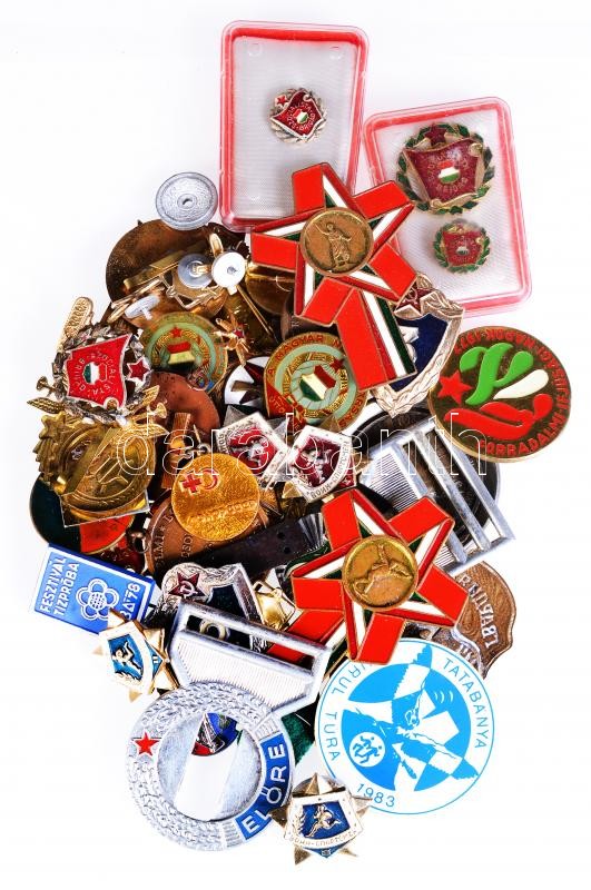 58db-os vegyes, szocialista jelvény, közte "Szocialista Brigád", "A Magyar Népköztársaság Úttörője", "A Magyar Népköztársaság Kisdobosa", "MOFÉM Törzsgárda", "MHSZ" és "Munkásőr" jelvények T:vegyes