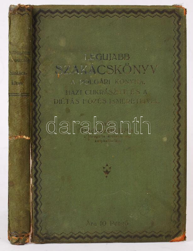 Podruzsik Béla: Legújabb szakácskönyv. A polgári konyha, házi cukrászat és a diétás főzés ismereteivel. Bp., 1928, Otthon Nyomda. Kiadói egészvászon kötés, gerincnél és a sarkainál szakadt, belül a gerincnél kissé levált, kopottas állapotban.