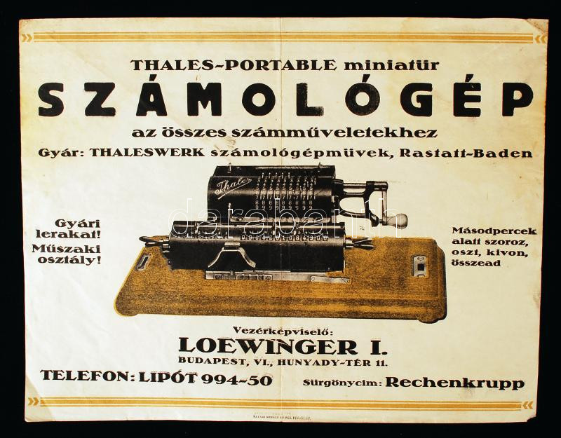 cca 1920-1930 Thales-Portable miniatűr számológép nagyméretű reklámpl... https://www.darabanth.com/de/216-Fernauktion/216.0/Andere-Sammelgebiete/Drucksachen~400027/cca-1920-1930-Thales-Portable-miniatur-szamologep-nagymeretu-reklamplakat-28x22-cm~II916332