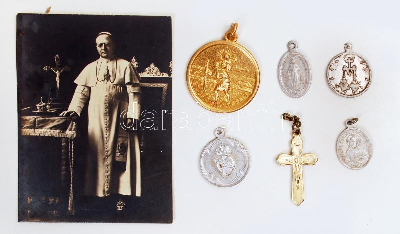 Beschreibung: 6 db keresztény motívumú medál, és XI. Pius pápáról készült fotó, 6x8 cm