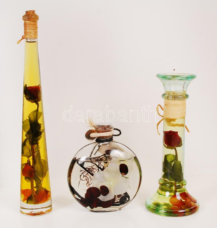 Beschreibung: Dekoratív kivitelezésű üveglámpás, fürdőolaj, belsejében virágokkal, 3 db