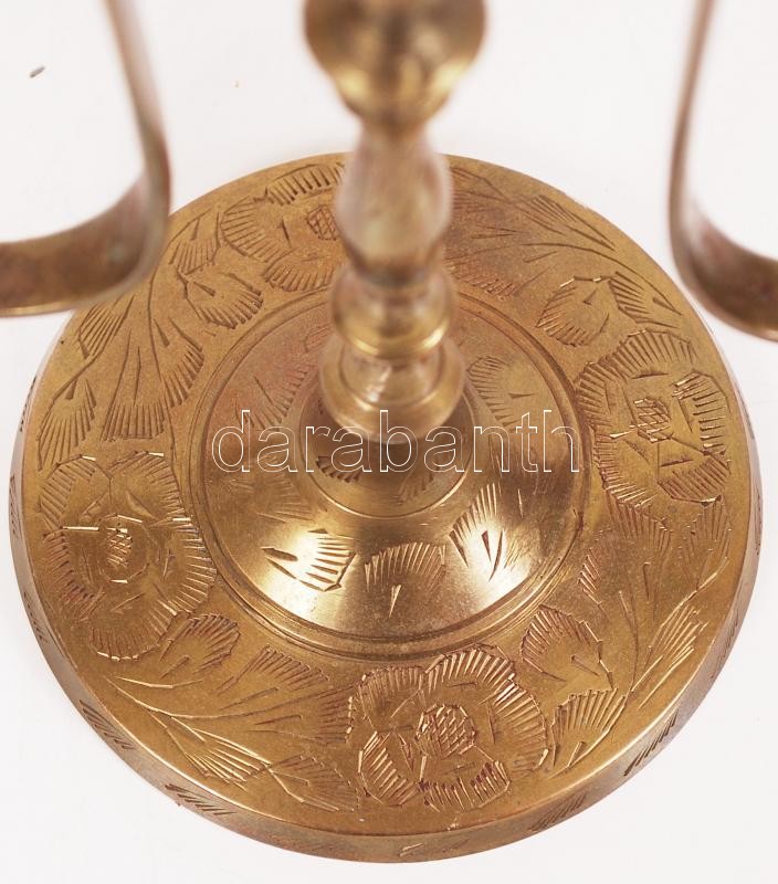 Beschreibung: Háromágú réz modern gyertyatartó, díszített talpal és szárakkal, jó állapotban, m:24 cm, h:18 cm