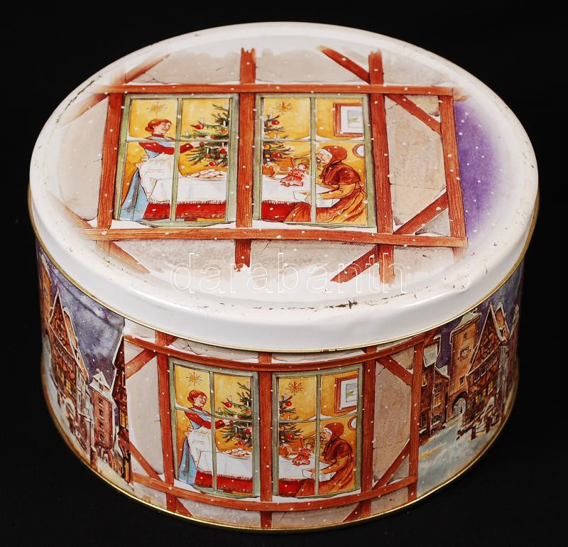 Nagyméretű, retro süteményes fém doboz, kopásokkal d:24, m:13 https://www.darabanth.com/de/216-Fernauktion/216.0/Andere-Sammelgebiete/Flohmarkt~400043/Nagymeretu-retro-sutemenyes-fem-doboz-kopasokkal-d24-m13~II916724