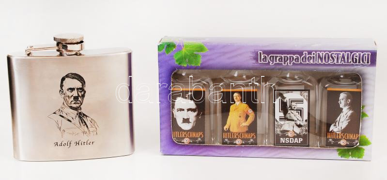 Beschreibung: Zsebben hordható pálinkás üveg Hitler gravírozással, és 4 üveg Hitlerschnaps (40% alkohol)