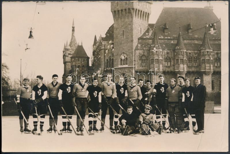 Beschreibung: 1928. december 16. Budapest, Városliget. A döntetlent játszott BKE – TEV hoki csapatok csoportképe, feliratozva, sarkán törésvonal, 12x18 cm