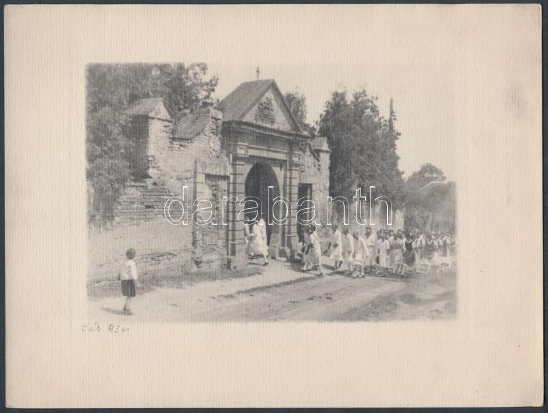 1930 Dr. Kovács Emil: Szigligeti temető bejárata, feliratozott vintage fotó, rézkarc utánzatú, ún. művészfólián keresztül készült nagyítás, képméret 11x16 cm, papírméret 18x24 cm