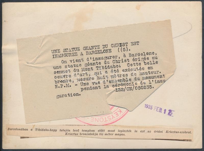 1935 Barcelona, A Krisztus-szobor leleplezése a Tibidabo-hegyen, sajtó... https://www.darabanth.com/de/216-Fernauktion/216.0/Andere-Sammelgebiete/Foto~400056/1935-Barcelona-A-Krisztus-szobor-leleplezese-a-Tibidabo-hegyen-sajtofoto-feliratozva-18x13-cm~II908811