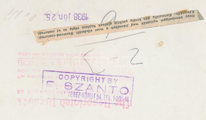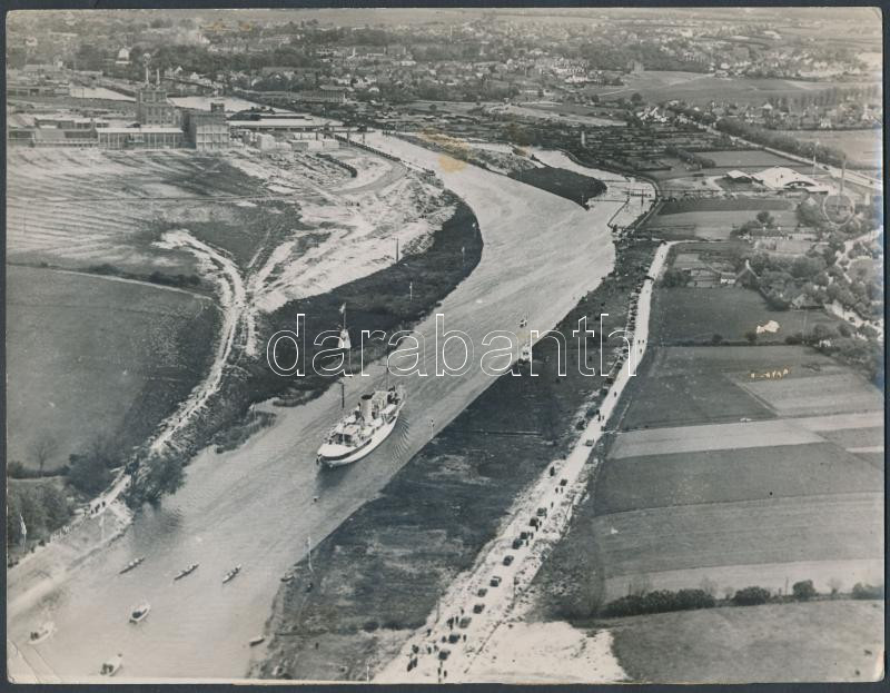 Beschreibung: 1938 Dánia, A Naestved-csatornán először hajózik végig Keresztély dán király jachtja, pecséttel jelzett, hátoldalán feliratozva, 21x16 cm
