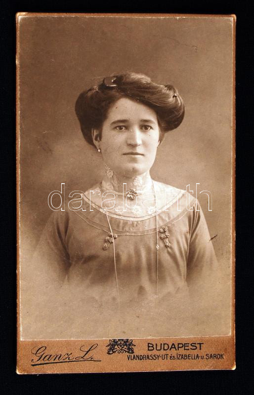 cca 1900 Hölgy arcképe, régi keményhátú fotó, Ganz L. műterme, 6x11 cm https://www.darabanth.com/de/216-Fernauktion/216.0/Andere-Sammelgebiete/Foto~400056/cca-1900-Holgy-arckepe-regi-kemenyhatu-foto-Ganz-L-muterme-6x11-cm~II914827