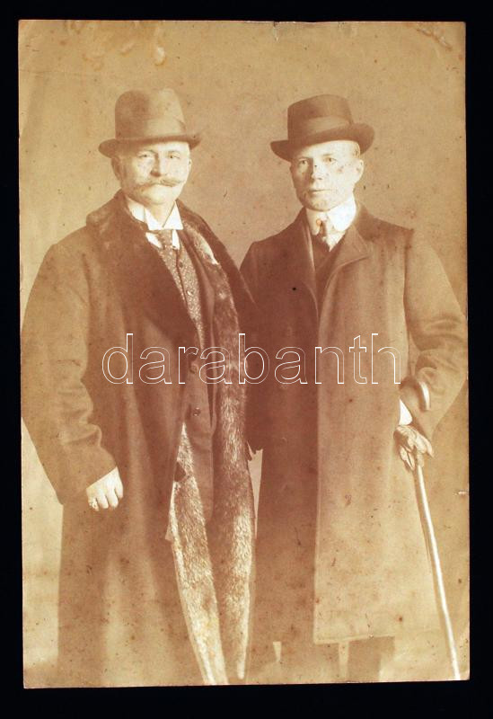 Beschreibung: cca 1910 Peremartoni Nagy Ákos huszárgenerális, későbbi tábornok egy másik úr társaságában, hátoldalon feliratozva, 14x22 cm