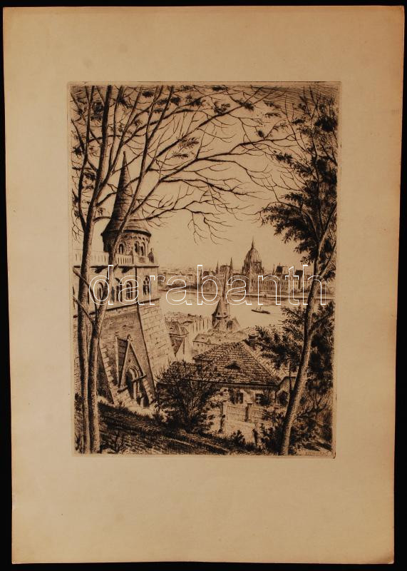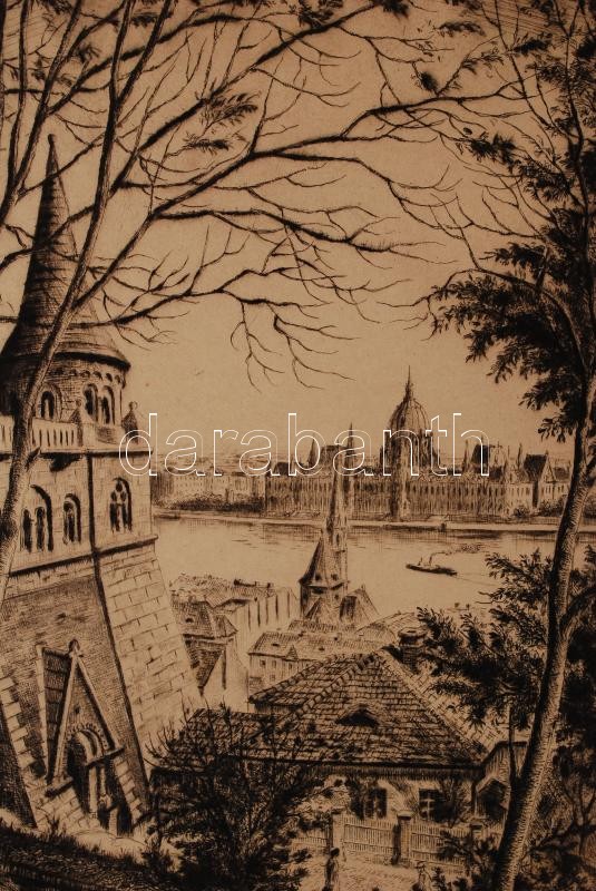 Beschreibung: Koch Ernő (1898-1970): Parlament Budáról. Rézkarc, papír, jelzett a karcon, 33×24 cm