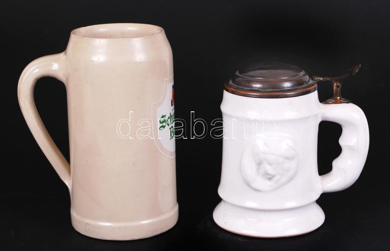 Beschreibung: 2 db kerámia korsó, egyiken apró lepattanás és réz fedő, m:15-20 cm