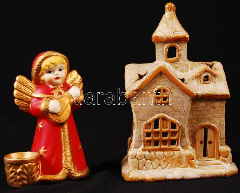 Beschreibung: Angyalka formájú gyertyatartó és házikó alakú mécsestartó, hibátlan, m: 12 és 16 cm