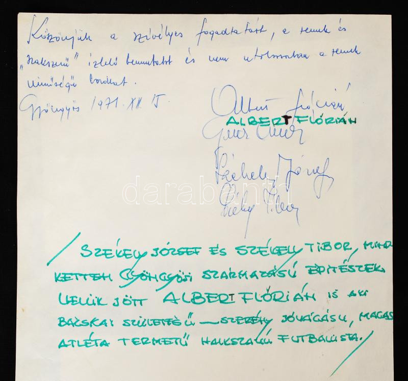 1971 Albert Flórián (1941-2011) aranylabdás válogatott labdarúgó pár s... https://www.darabanth.com/de/216-Fernauktion/216.0/Andere-Sammelgebiete/Signatur~400055/1971-Albert-Florian-1941-2011-aranylabdas-valogatott-labdarugo-par-soros-bejegyzese-es-al~II915283