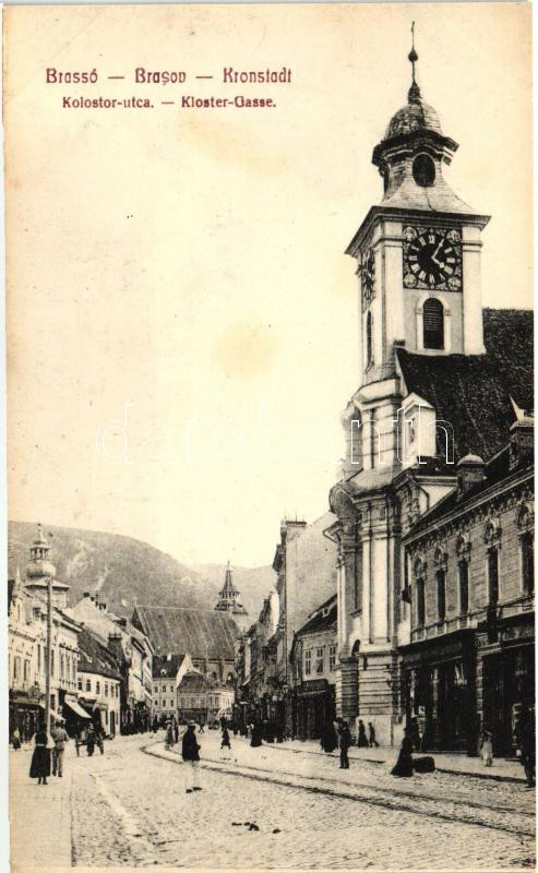 Brassó, Kronstadt; Kolostor utca, templom / street, church https://www.darabanth.com/de/216-Fernauktion/216.0/Ansichtskarten/Siebenburgen~400017/Brasso-Kronstadt-Kolostor-utca-templom-street-church~II908650