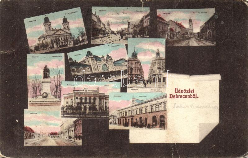 Beschreibung: Debrecen, Református nagytemplom, Piac utca, Hatvan utca, Csokonai szobor, színház, vasútállomás, Bika szálloda, Simonffy utca a bérpalotákkal (fa)