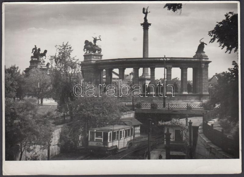 cca 1960 Tiszavölgyi József közlekedés történeti felvétele a kisföldalattiról, amelynek pályája csak a Hősök terétől volt valóban föld alatti, a kép hátoldalán emlékbélyeg és emlékpecsét az MTA alapításának 150 éves évfordulójára (1975), pecséttel, aláírással jelzett vintage fotó,13x18 cm