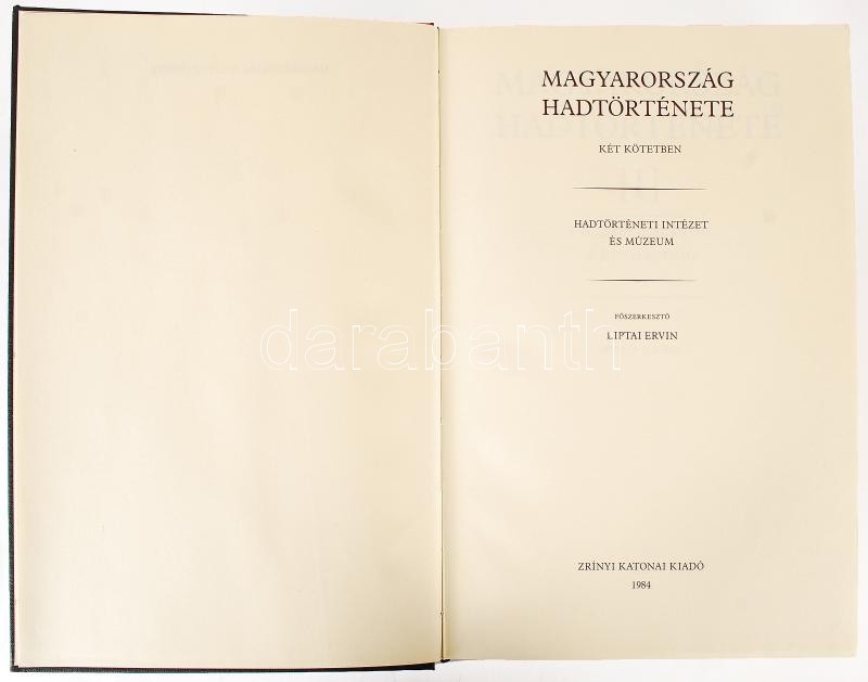 Liptai Ervin(szerk.): Magyarország hadtörténete két kötetben. Bp., 1985, Zrínyi Katonai Kiadó. Kiadói aranyozott egészvászon kötés, védőborítóval, képekkel illusztrált, jó állapotban.