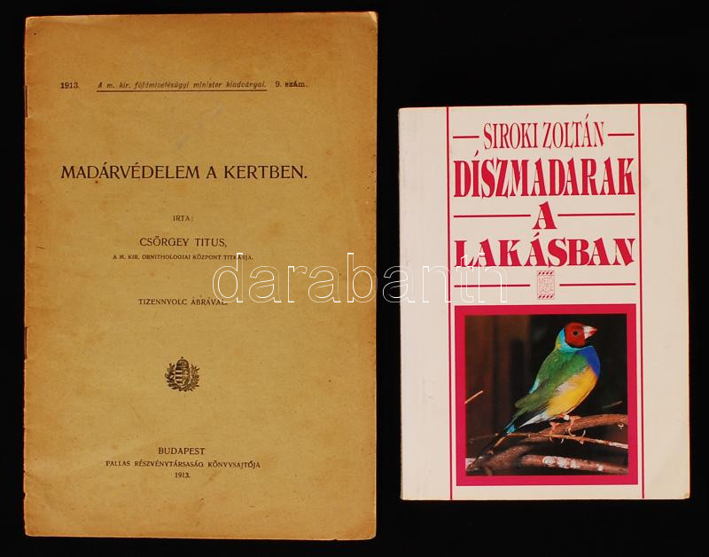 2 db madártani kézikönyv: Csörgey Titusz: Madárvédelem a kertben. Bp., 1913, Pallas Rt. (A m. kir. földmivelésügyi minister kiadványai 9.); Siroki Zoltán: Díszmadarak a lakásban. Bp., 1994, Mezőgazda Kiadó. Papírkötésben, jó állapotban.