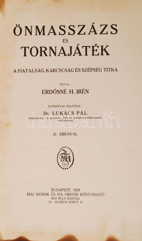 Erdősné H. Irén: Önmasszázs és torna játék. Bp., 1928. Mai Henrik és f... https://www.darabanth.com/de/218-Fernauktion/218.0/Andere-Sammelgebiete/Bucher-Sonstige-Raritaten~200040/Erdosne-H-Iren-Onmasszazs-es-torna-jatek-Bp-1928-Mai-Henrik-es-fia-orvosi-konyvkiadC3~II909806