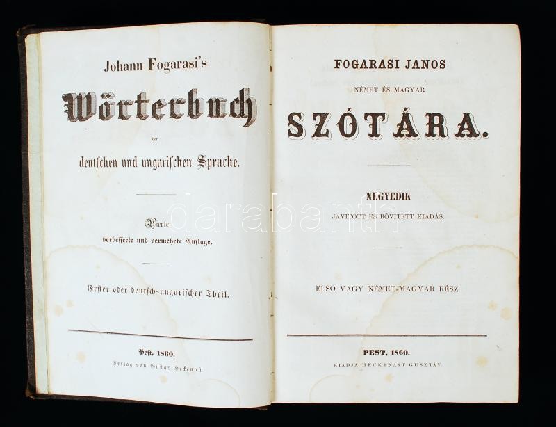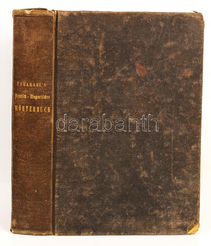 Fogarasi János német és magyar szótára. Negyedik javított és bővített kiadás. Első vagy német-magyar rész. Pest, 1860, Heckenast Gusztáv. Kiadói egészvászon kötés, gerincnél és sarkainál szakadt, lapok foltosak, kopottas állapotban.
