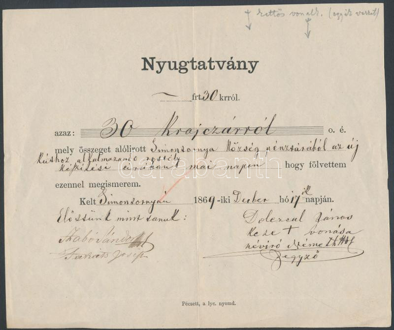 Beschreibung: 1869 30 krajcárról szóló nyugtatvány az új simontornyai kút rostélyának tárgyában.