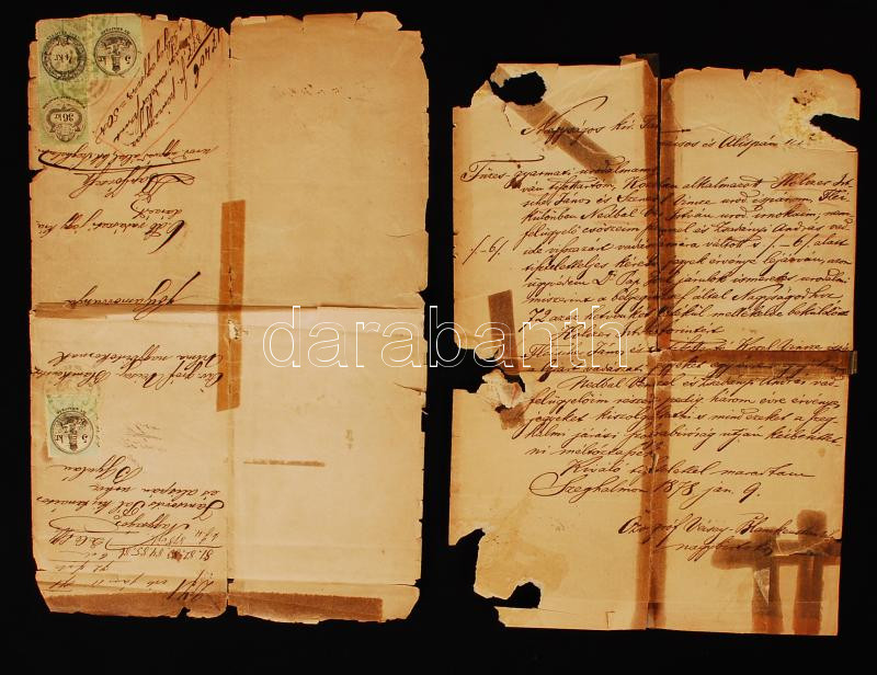 1878 Vadászati jegy kibocsátására vonatkozó kérelem, kézbesítési ívvel együtt, a kérelmező, özv. gróf Vécsey-Blankenstein Vilma aláírásával. Erősen szakadt, utólagos ragasztásokkal.
