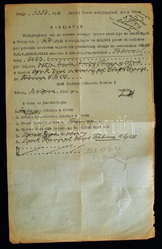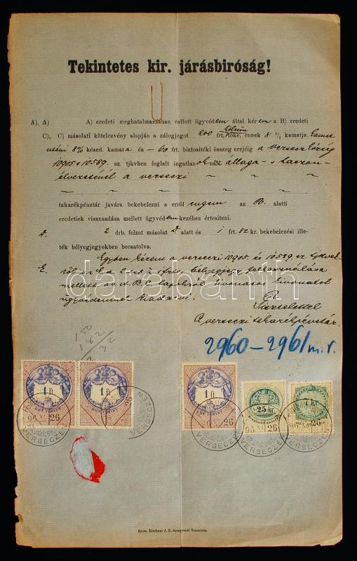 1896 Kérvény a verseci magyar királyi járásbírósághoz zálogjogok ügyében, 3 db 1 Ft-os, 1 db 25 krajcáros és 1 db 7 krajcáros illetékbélyeggel, rányomott viaszpecsét nyomával. A hátlapján a verseci bíróság szerb nyelvű határozata 1946-ból.