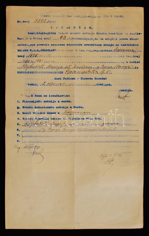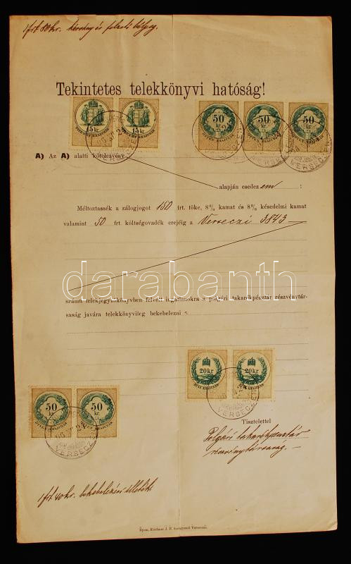 1896 Kérvény a verseci telekkönyvi hatósághoz zálogjogok ügyében, 5 db 50 krajcáros, 2 db 20 krajcáros és 2 db 15 krajcáros illetékbélyeggel. A hátlapján a verseci bíróság szerb nyelvű határozata 1946-ból.