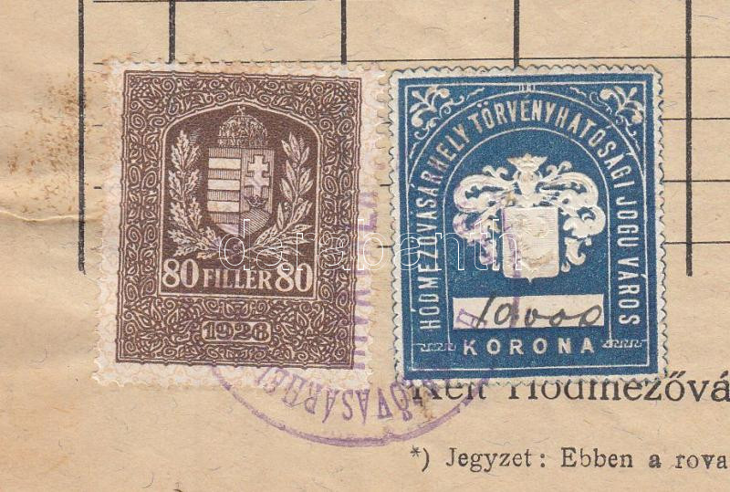 Beschreibung: 1927 Hódmezővásárhely városi illetékbélyeg 10.000 kézírással teljes iraton