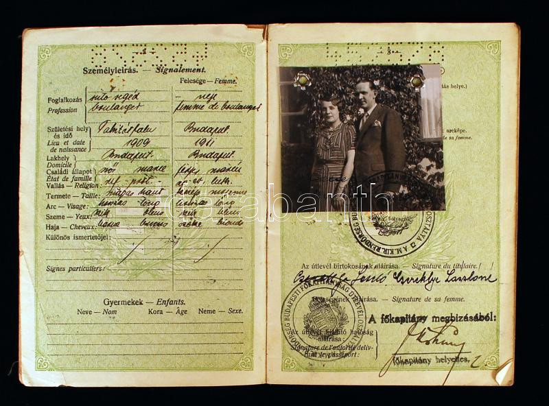 1935 Magyar Királyság által kibocsátott fényképes útlevél házaspár rés... https://www.darabanth.com/de/218-Fernauktion/218.0/Andere-Sammelgebiete/Dokument~200027/1935-Magyar-Kiralysag-altal-kibocsatott-fenykepes-utlevel-hazaspar-reszere--3Cbr3E1935-H~II927995