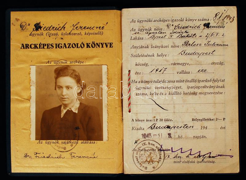 1943 Bp., Ügynök (utazó, üzletszerző, képviselő) arcképes igazolványa https://www.darabanth.com/de/218-Fernauktion/218.0/Andere-Sammelgebiete/Dokument~200027/1943-Bp-Ugynok-utazo-uzletszerzo-kepviselo-arckepes-igazolvanya~II927997