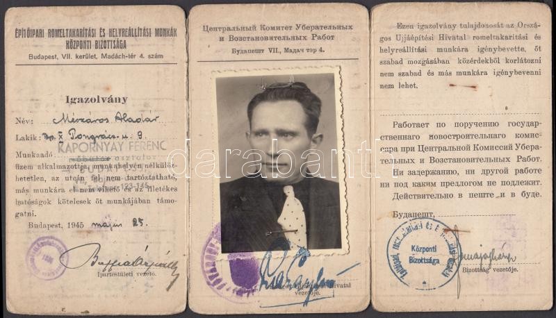 Beschreibung: 1945 Bp., Építőipari Romeltakarítási és Helyreállítási Munkák Központi Bizottsága által kiállított fényképes igazolvány magyar és orosz nyelven