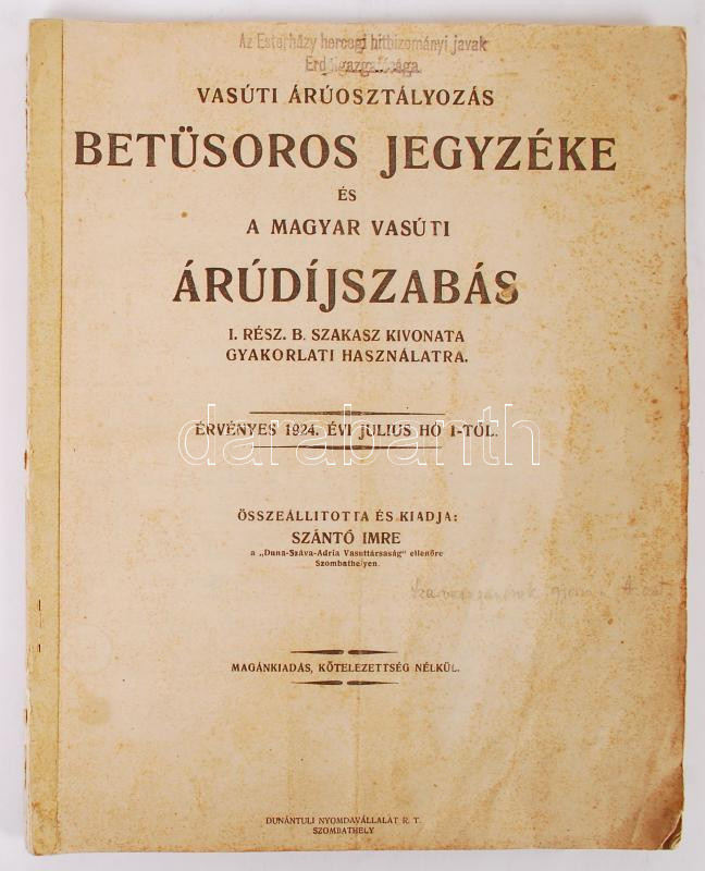 1924 A vasúti áruosztályozás betűsoros jegyzéke és a magyar vasúti áru... https://www.darabanth.com/de/218-Fernauktion/218.0/Andere-Sammelgebiete/Drucksachen~200010/1924-A-vasuti-aruosztalyozas-betusoros-jegyzeke-es-a-magyar-vasuti-arudijszabas-23p~II902356