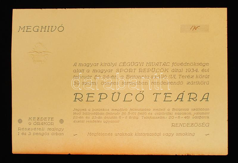 1934 Bp., meghívó a Magyar Királyi Légügyi Hivatal fővédnöksége alatt ... https://www.darabanth.com/de/218-Fernauktion/218.0/Andere-Sammelgebiete/Drucksachen~200010/1934-Bp-meghivo-a-Magyar-Kiralyi-Legugyi-Hivatal-fovednoksege-alatt-a-Sportrepulok-alt~II927383