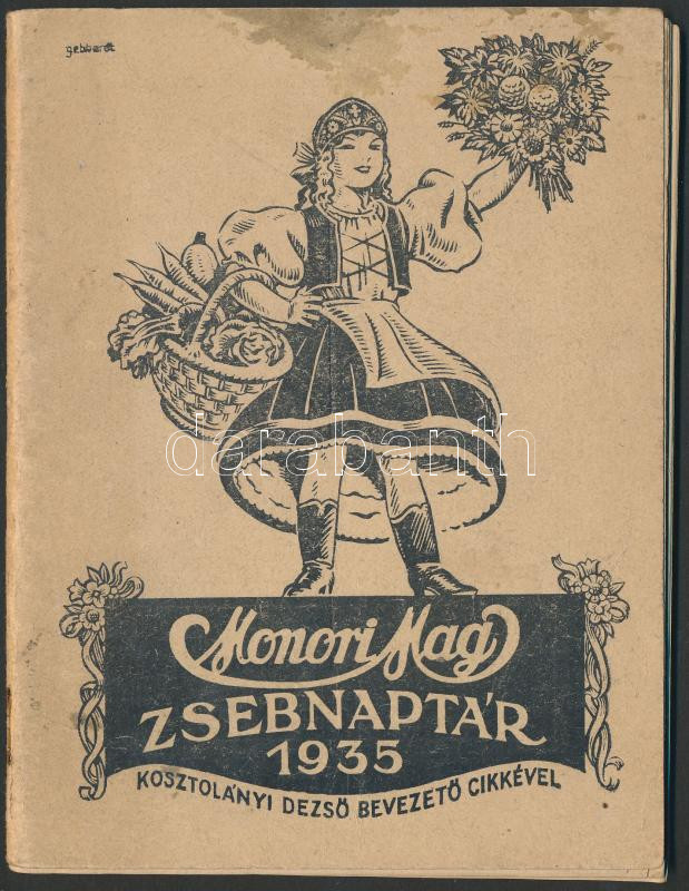 1935 Monori Mag zsebnaptára, Kosztolányi Dezső bevezető írásával. Kiadja a Magyar Magtenyésztési Rt. Monori Magkereskedése. A borító elválik a kötéstől.