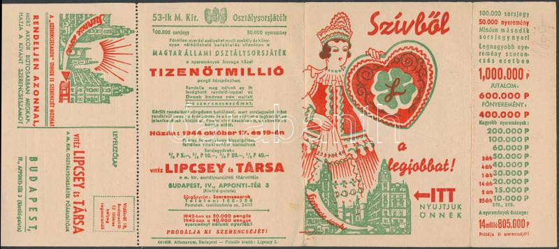 1944 Szívből a legjobbat - az 53. Magyar Királyi Osztálysorsjáték szerencseszámainak listája, megrendelőlappal együtt. Kiadja a Magyar Állami Osztálysorsjáték.