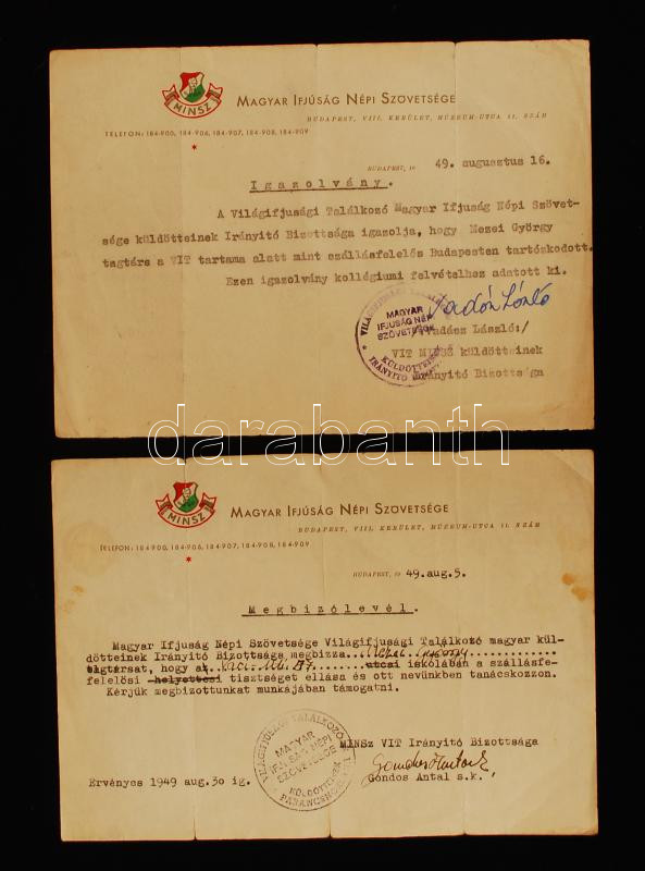 1949 Bp., a Magyar Ifjúság Népi Szövetsége igazolása és megbízólevele ... https://www.darabanth.com/de/218-Fernauktion/218.0/Andere-Sammelgebiete/Drucksachen~200010/1949-Bp-a-Magyar-Ifjusag-Nepi-Szovetsege-igazolasa-es-megbizolevele-a-Vilagifjusagi-Ta~II927468