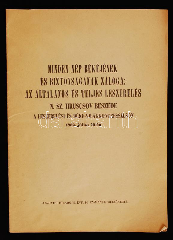 Minden nép békéjének és biztonságának záloga: az általános és teljes leszerelés. N. Sz. Hruscsov beszéde a leszerelési és béke-világkongresszuson 1962. július 10-én. A Szovjet Híradó VI. évf. 14. számának melléklete.