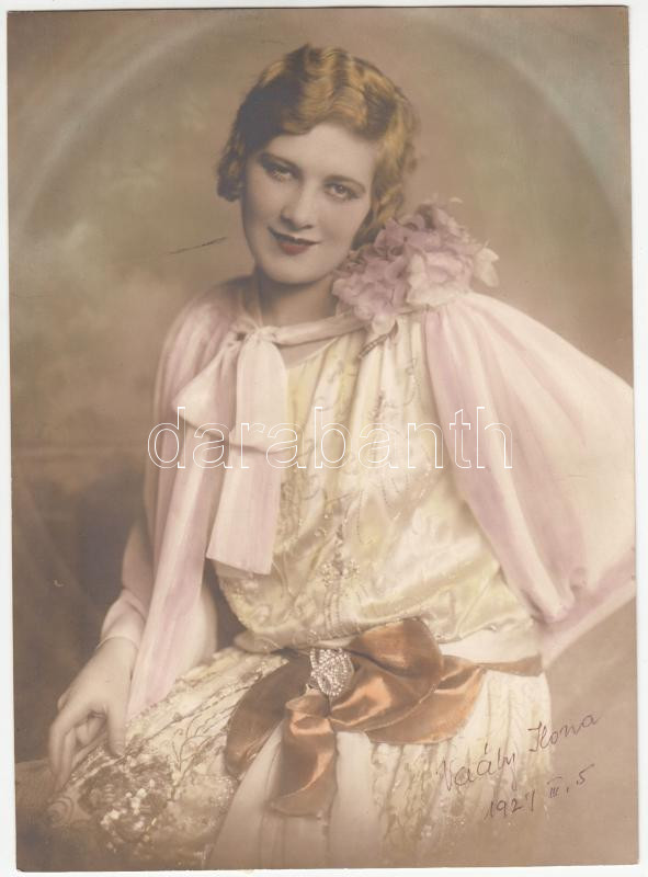 Beschreibung: 1927 március 5. Vaály Ilona (1899-1964) színésznő dedikált, kézzel színezett műtermi fotója, 19x14 cm