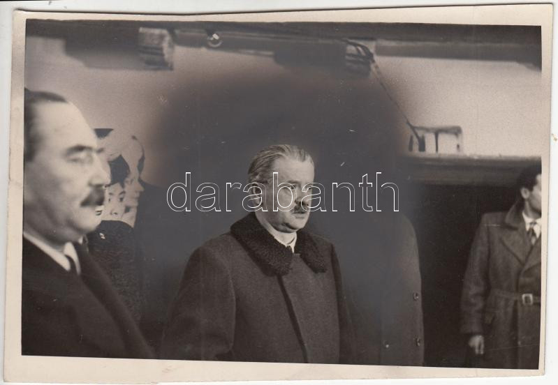 cca 1948 Tildy Zoltán (1889-1961) lelkész, Köztársasági elnök, a körülötte állókat kiretusálták, a kép bal szélén valószínűleg Nagy Imre látható, törésnyom a jobb szélen, 10x14 cm