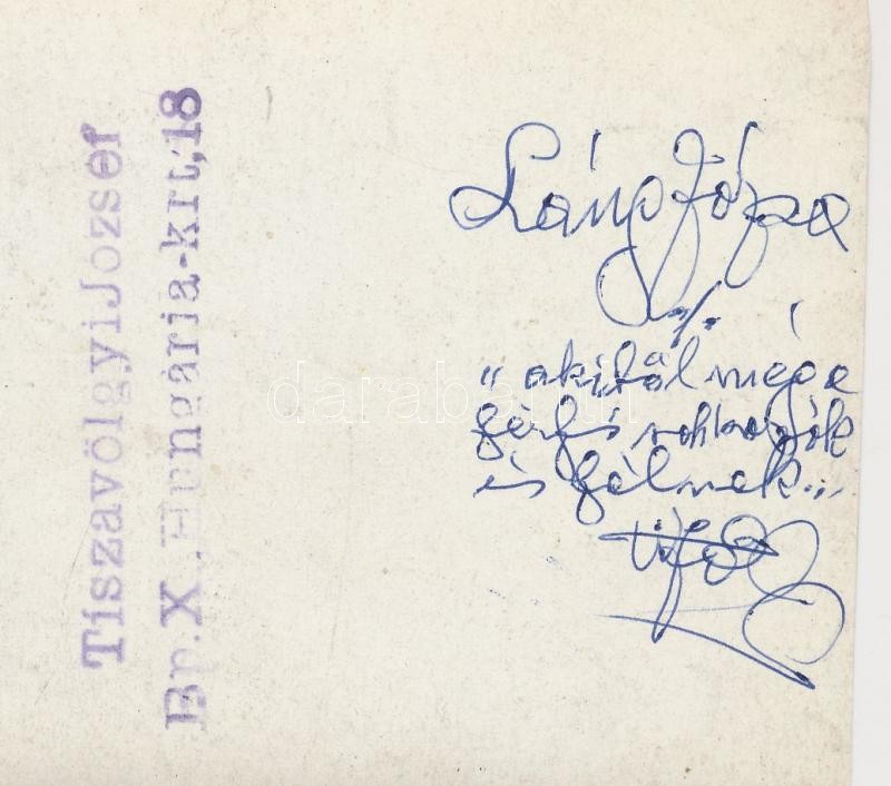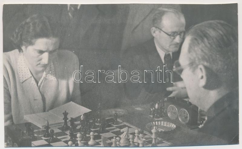 cca 1950 Tiszavölgyi József: Lángos Józsa sakkozónő (kilencszeres magyar bajnok), akitől a férfi sakkozók is félnek, pecséttel jelzett feliratozott kép, 9x14 cm