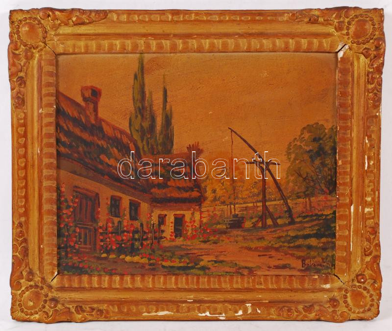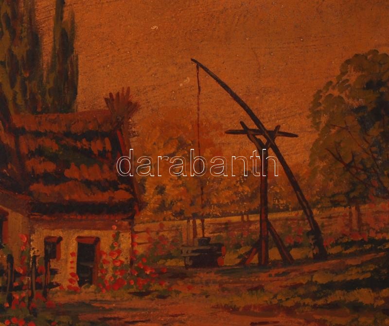 Beschreibung: Bakányi jelzéssel: Gémeskút az udvaron. Olaj, karton, antik sérült keretben, 31×37 cm